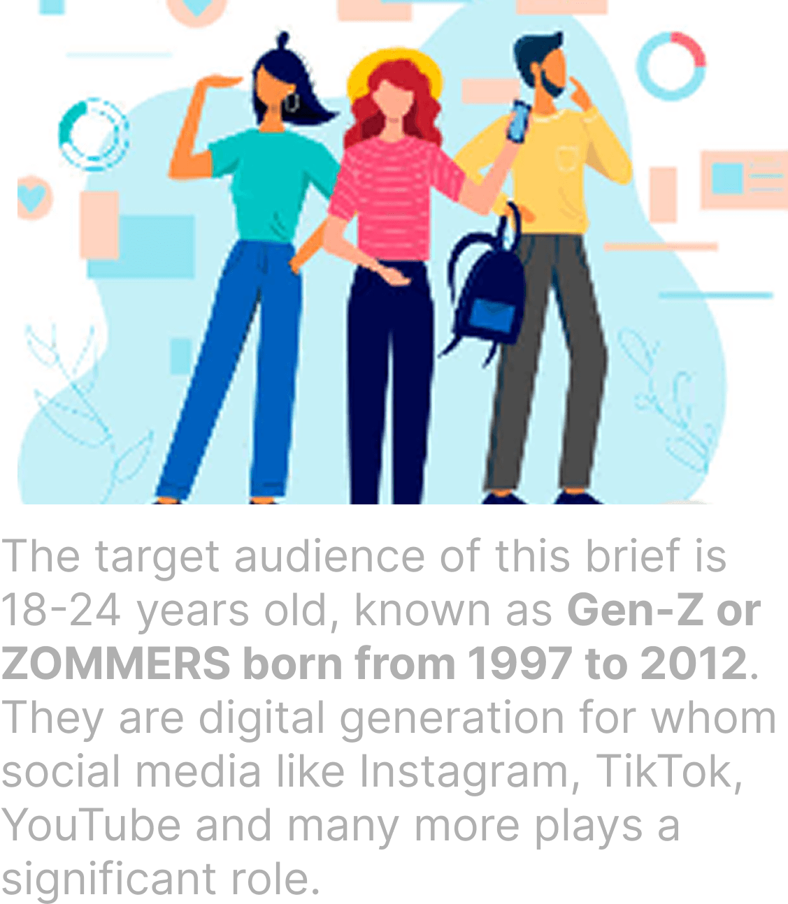 The target audience of this brief is 18-24 years old, known as Gen-Z or ZOMMERS born from 1997 to 2012. They are digital generation for whom social media like Instagram, TikTok, YouTube and many more plays a significant role.