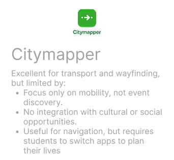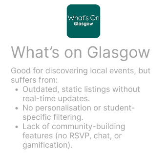 A competitive review of What’s On Glasgow and Citymapper revealed clear opportunities. While both offer valuable functions, neither fully addresses the needs of international students looking for an integrated social, cultural, and lifestyle experience. By bridging these gaps, GlasGroov positions itself as a centralised, student-first platform combining event discovery, social connection, and local discounts in one app.