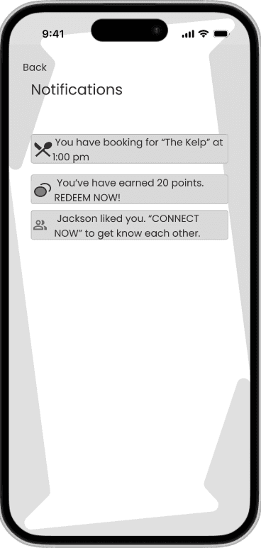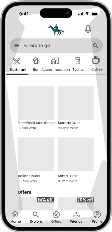 To quickly validate ideas, I created low-fidelity wireframes that mapped out the core flows — event booking, restaurant booking, friend search, and gamification features. Keeping the designs simple allowed me to test navigation and information hierarchy early without being distracted by visuals. Feedback from students at this stage helped me spot pain points, refine the bottom navigation, and prioritize the features that mattered most before moving into detailed design.