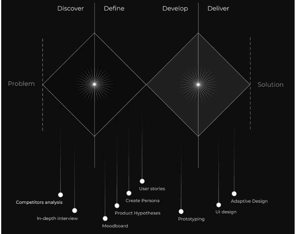 I applied the Double Diamond framework to keep my process structured and human centered. In the Discover phase, I explored the lived experiences of international students through surveys and interviews, identifying pain points around event discovery, affordability, and isolation. During Define, I synthesized insights into personas and journey maps to clarify the real challenge: students needed a single, reliable way to find and join activities. In Develop, I experimented with wireframes and navigation patterns, iterating based on usability feedback to simplify the experience around three core features — Events, Discounts, and Chat. Finally, in Deliver, I crafted high-fidelity prototypes with a clean, student-friendly interface and validated them through usability testing. This structured approach helped me move from broad exploration to a focused, validated solution that balanced usability with community impact.